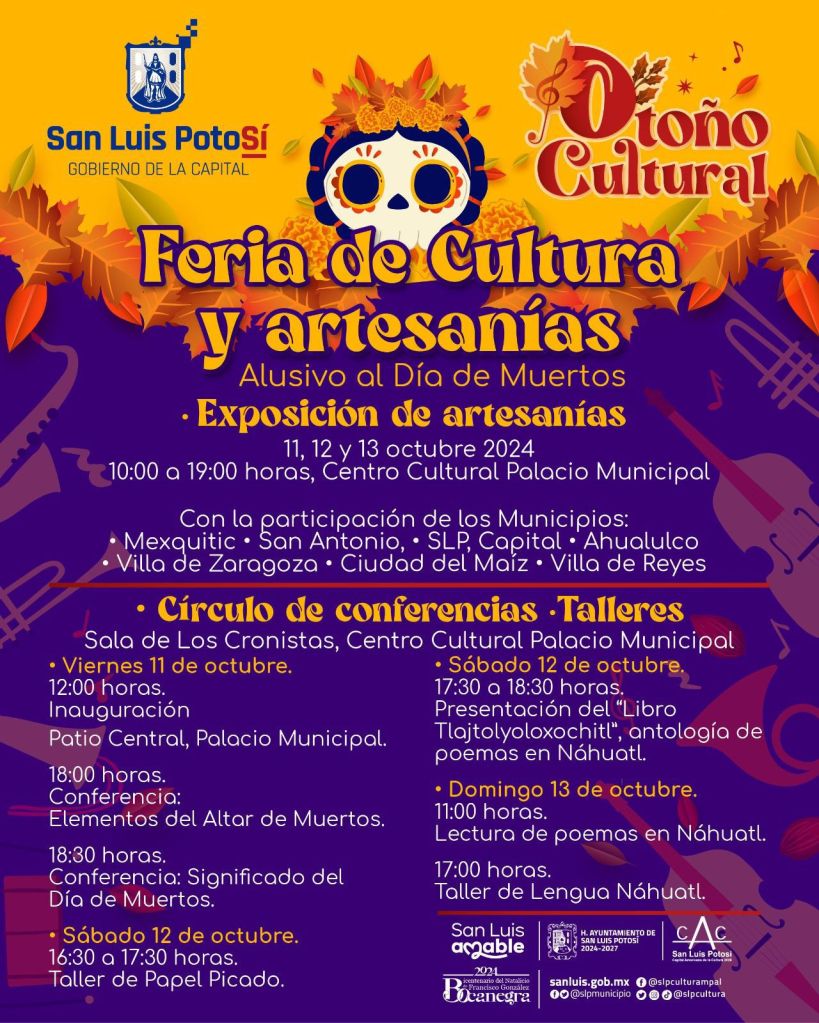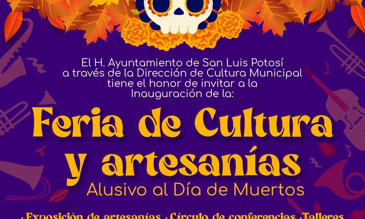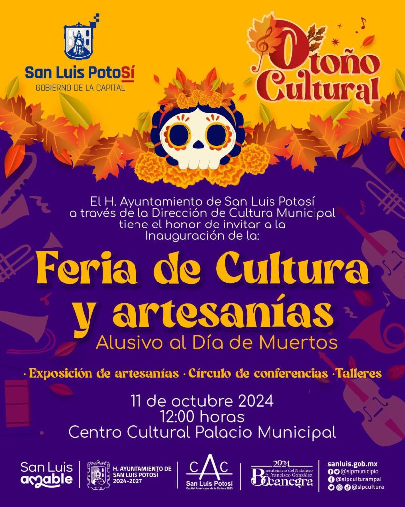 El Gobierno Municipal de San Luis Potosí, a través de la Dirección de Cultura Municipal, invita a la ciudadanía a participar en la Feria de Cultura y Artesanías en conmemoración del Día de Muertos. Este evento se llevará a cabo del 11 al 13 de octubre de 2024 en el patio del Centro Cultural Palacio Municipal, de 10:00 a 19:00 horas.