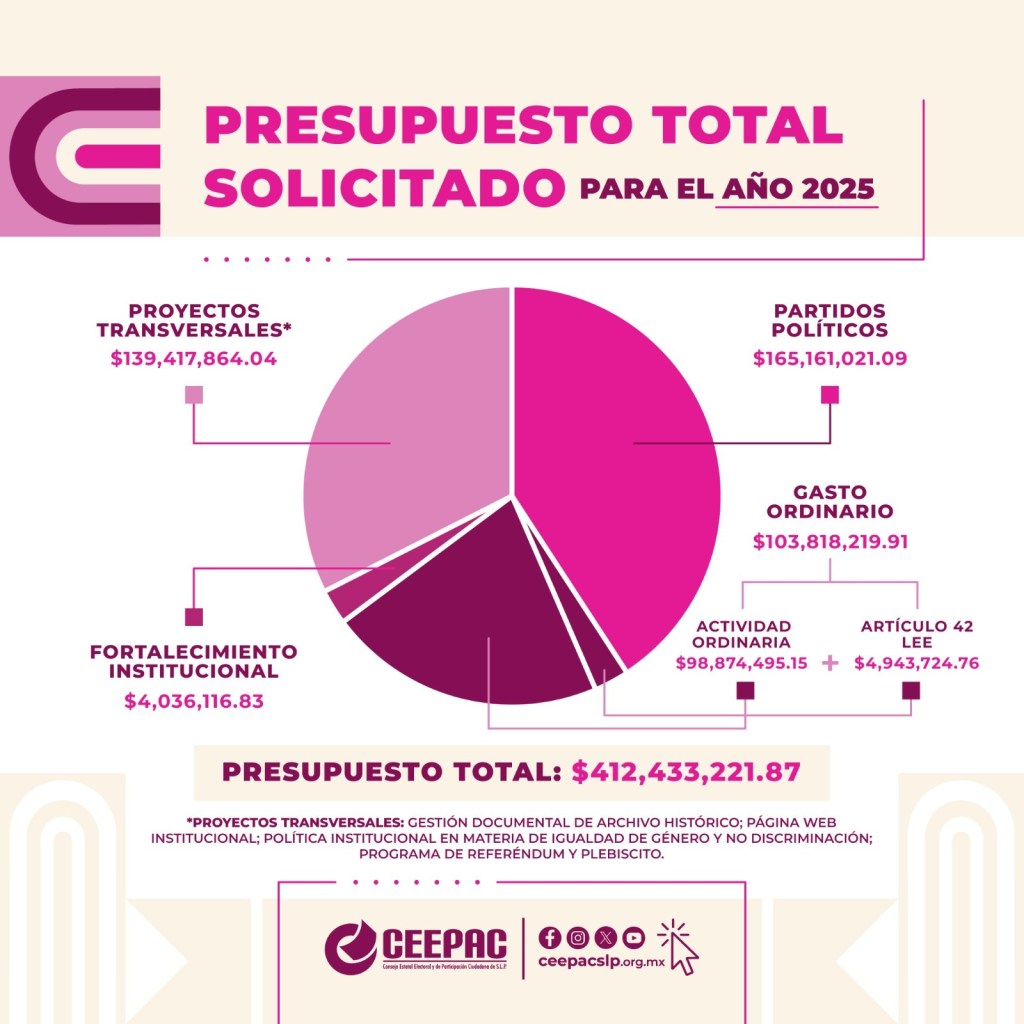 El presupuesto global para ejercicio fiscal 2025, considerando el presupuesto total para organismo electoral y el financiamiento público de los partidos políticos registrados ante el organismo electoral para mismo ejercicio fiscal es de $412 millones, 433 mil, 221.87 pesos