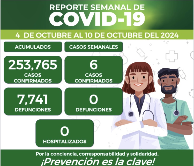 El Comité Estatal para la Seguridad en Salud, dio a conocer que del 04 al 10 de octubre se registraron 6 nuevos contagios de COVID-19 en el estado, confirmando un total de 253 mil 765 casos totales de esta enfermedad. Las personas contagiadas del virus, cuentan solo con esquema de vacunación completa el 25 por ciento, y no vacunado el 75 por ciento, y dentro de las comorbilidades que presentan se encuentran la hipertensión arterial y la diabetes mellitus.