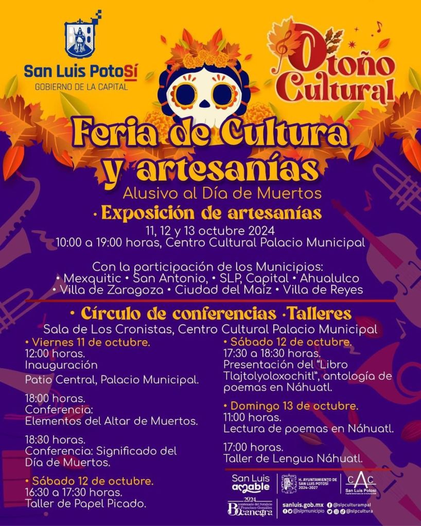 Además, la celebración se enriquecerá con la continuación de la Feria de Cultura y Artesanías alusiva al Día de Muertos, en el patio del Centro Cultural Palacio Municipal. Desde las 10:00 hasta las 19:00 horas, se llevará a cabo un círculo de conferencias, talleres y una exposición de artesanías que presentarán el talento de los municipios de Mexquitic, San Antonio, San Luis Capital, Ahualulco, Villa de Zaragoza, Ciudad del Maíz y Villa de Reyes. Esta feria es un espacio que no solo celebra nuestras tradiciones sino que también ofrece una plataforma para que los artesanos de la región exhiban su trabajo y su contribución a la cultura local.
