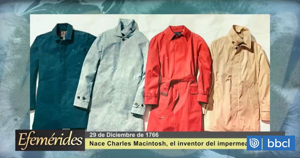 El químico Charles Macintosh patenta en Glasgow (Escocia) una prenda de vestir resistente al agua: el impermeable Mackintosh.