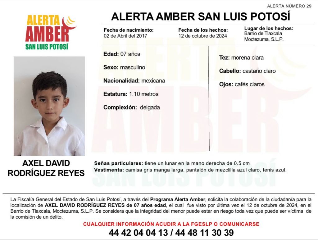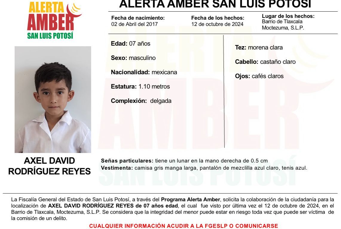 La Fiscalía General del Estado de San Luis Potosí (FGESLP) activó una Alerta Amber para ubicar a Axel David Rodríguez Reyes, un menor de siete años de edad.