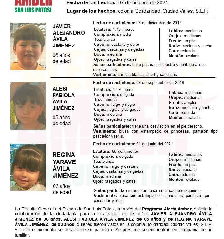 Javier Alejandro, Alesi Fabiola y Regina Yarave de apellidos Ávila Jiménez de 6, 5 y 3 años de edad respectivamente fueron vistos por última vez el 7 de octubre de 2024 en la colonia Solidaridad del municipio ya referido, y de los cuales se presume en encuentran en compañía de un familiar.
