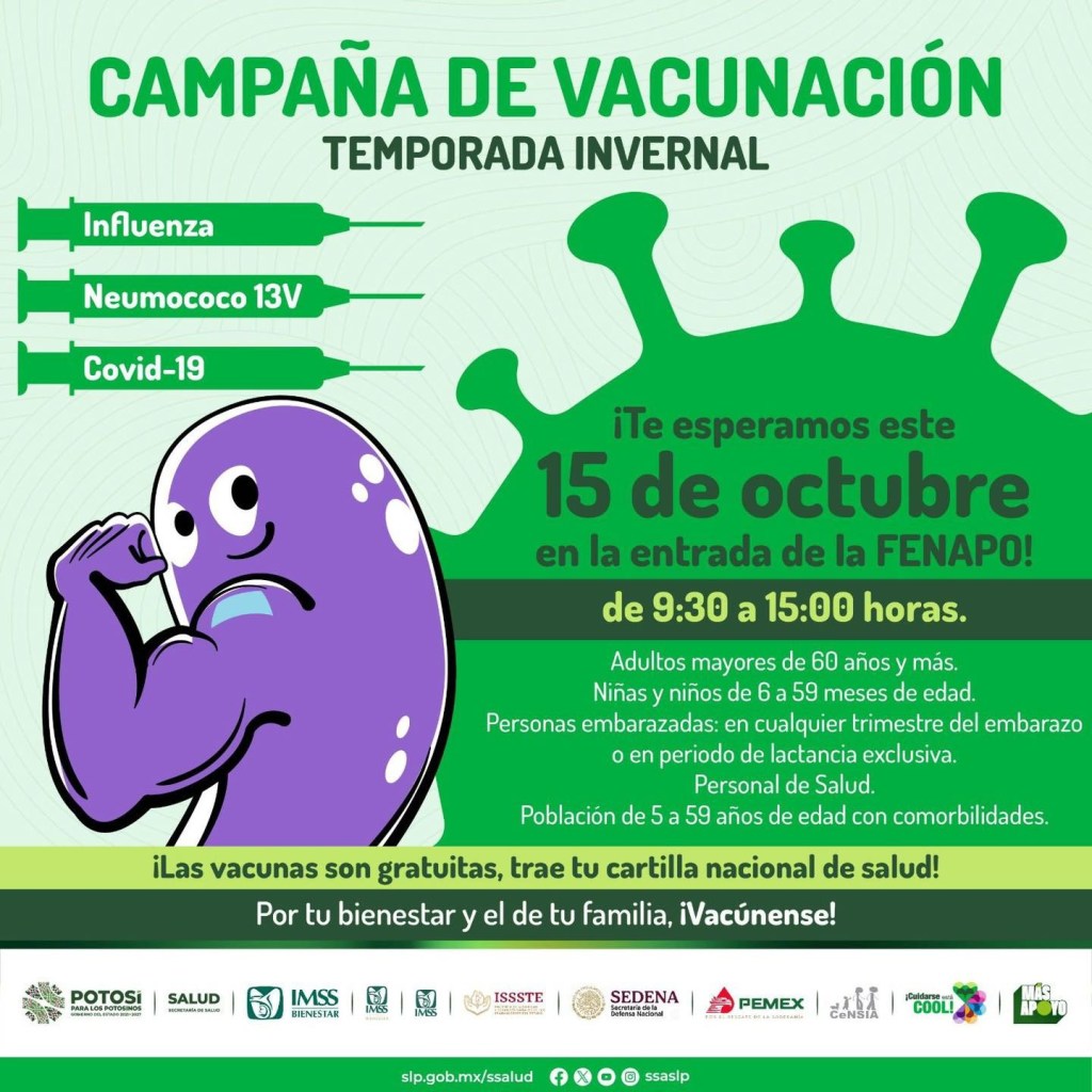 El Gobierno del Estado a través de los Servicios de Salud invita a la población potosina al inició de la Jornada Invernal de Vacunación, en dónde podrán vacunarse contra influenza, neumococo 13V y Covid, el próximo 15 de octubre en la velaría en las instalaciones de la FENAPO en un horario de 9:30 a 15:00 horas, informó la titular de la dependencia, Dra. Elizabeth Dávila Chávez.