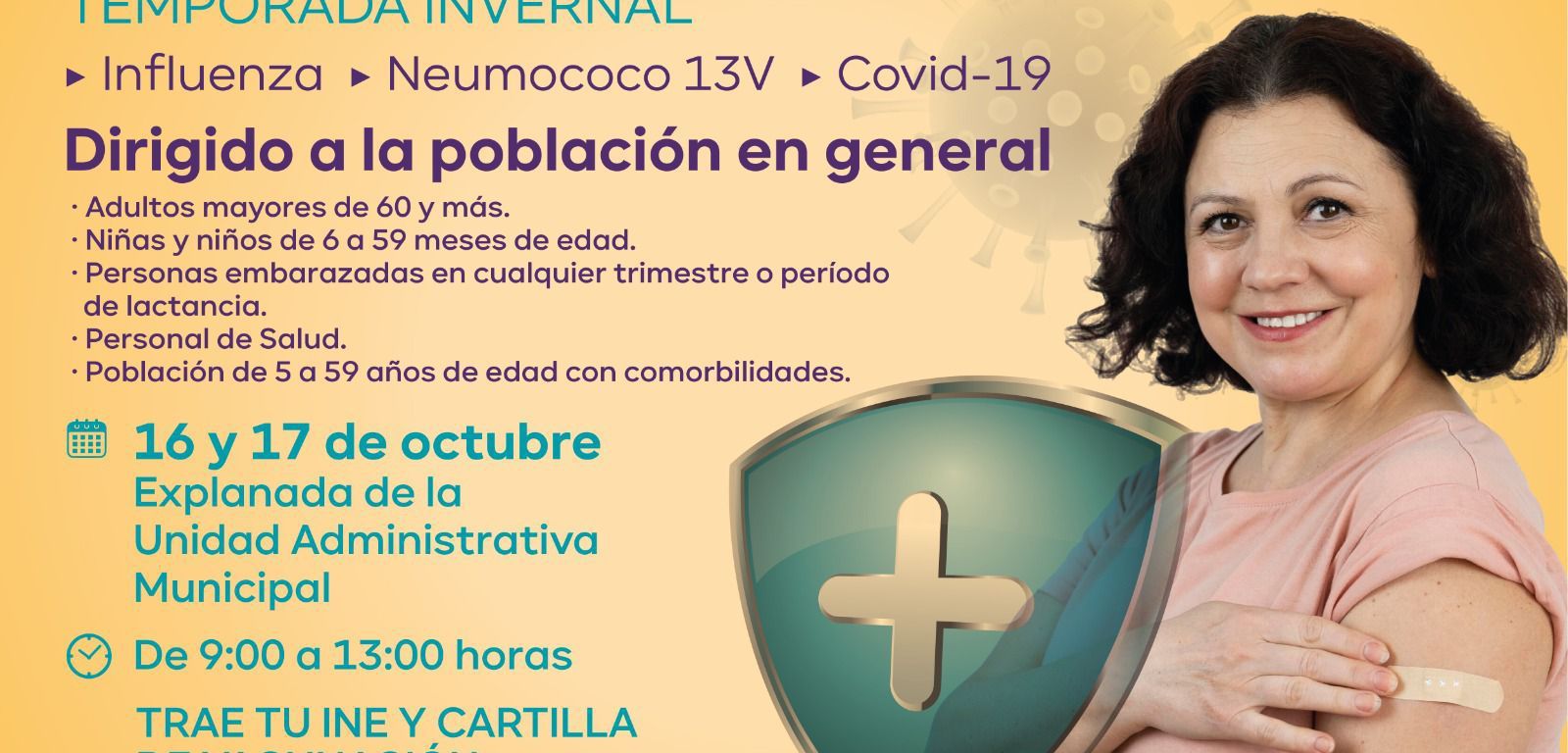 Las dosis por aplicarse son: influenza, neumococo 13V y Covid 19; es necesario presentar INE y cartilla de vacunación.