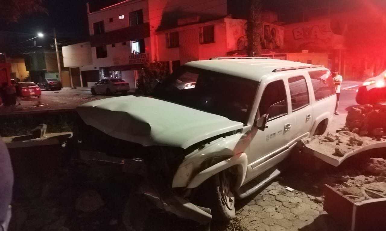 De acuerdo al reporte de la jefatura de hechos de tránsito terrestre de la SSPC, cerca de las 23:30 horas de este martes, se acudió al reporte de un choque en la avenida Prolongación Muñoz y calle del Chopo de la colonia Jacarandas, donde se encontró una vagoneta marca Chevrolet Suburban color blanco con rótulos oficiales de gobierno estatal, cuyo conductor habia impactado contra el muro de mampostería de la glorieta de Jacarandas presuntamente tras la pérdida de control del volante.