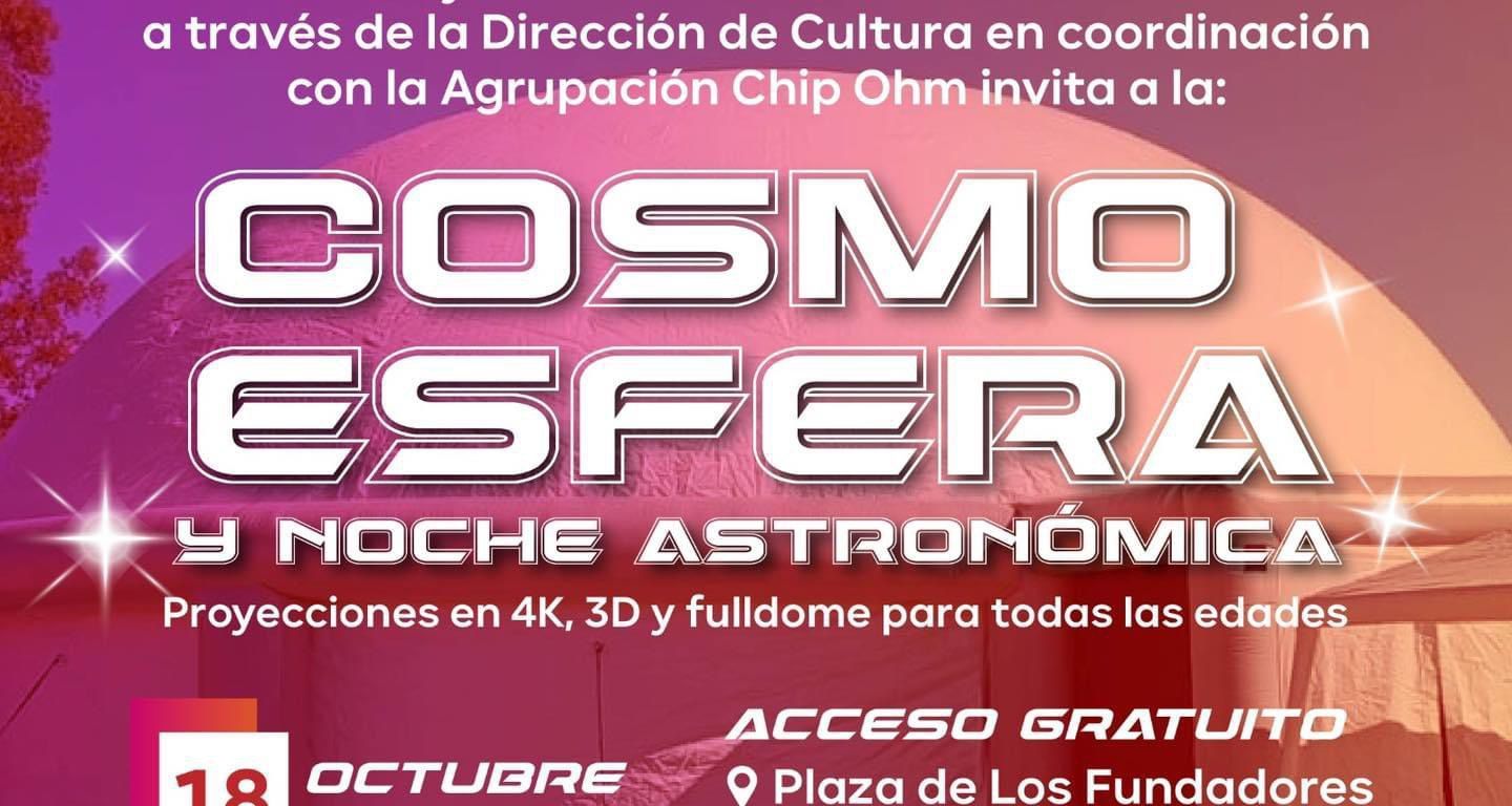 El Gobierno Municipal, a través de su Dirección de Cultura, en colaboración con la Agrupación Chip Ohm, invitan a toda la ciudadanía a una experiencia única: la “Cosmo Esfera” y noche astronómica. Este evento promete ser una fiesta de conocimientos y observaciones celestiales que no te querrás perder.