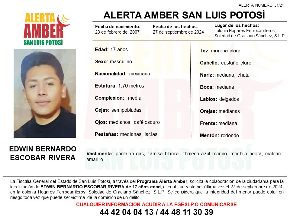 La Fiscalía General del Estado de San Luis Potosí (FGESLP) activó una Alerta Amber para localizar a un adolescente, al cual se le vio por última vez en la colonia Hogares Ferrocarrileros del municipio Soledad de Graciano Sánchez, SLP.