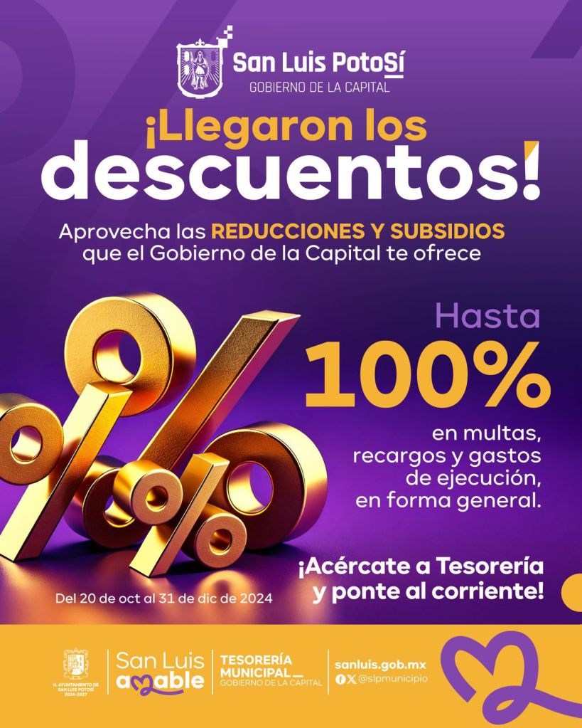 La Tesorería Municipal informó que, en cuanto al impuesto predial, los incentivos del 100 por ciento en multas y del 50 por ciento en recargos comenzarán a aplicarse a partir del 21 de octubre y se mantendrán hasta final del mes; mientras que durante todo noviembre el descuento será del 80 por ciento en multas y 50 por ciento en recargos; y en diciembre el descuento será de 50 por ciento en multas y 40 por ciento en recargos.