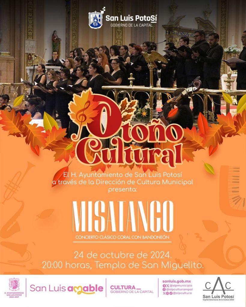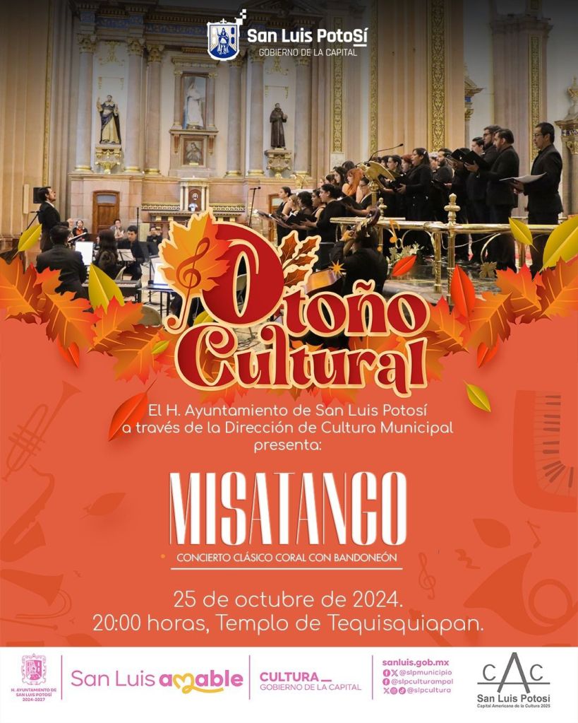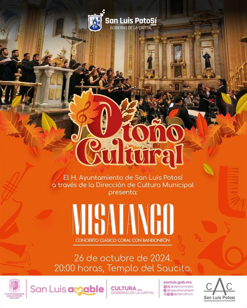 El Gobierno Municipal de San Luis Potosí, a través de su Dirección de Cultura Municipal y en colaboración con la agrupación Arte y Alma, invitan al segundo ciclo de «Misatango», un concierto clásico coral con bandoneón que promete cautivar a los asistentes con una fusión única de ritmos y melodías.