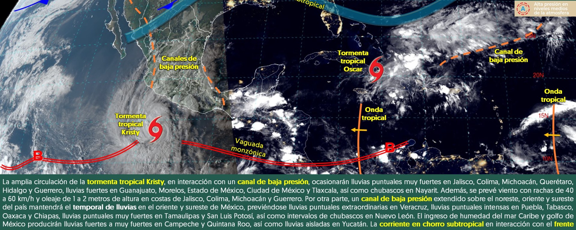 Lluvias aisladas (0.1 a 5 mm): Sinaloa, Coahuila, Nuevo León, Zacatecas, Aguascalientes, Guanajuato, Querétaro, Ciudad de México, Tlaxcala, Morelos, Tamaulipas, San Luis Potosí, Hidalgo y Yucatán.