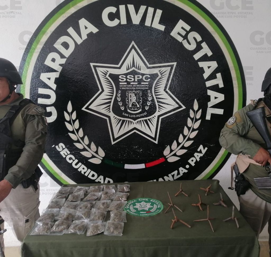 Guadalcázar, S.L.P.- Como parte de las acciones operativas que se han intensificado en esta región del Estado para el combate a la delincuencia, agentes de la Guardia Civil Estatal (GCE) en coordinación con Ejército mexicano, aseguraron más de un kilo de marihuana y artefactos de varilla conocidos como “poncha llantas”.