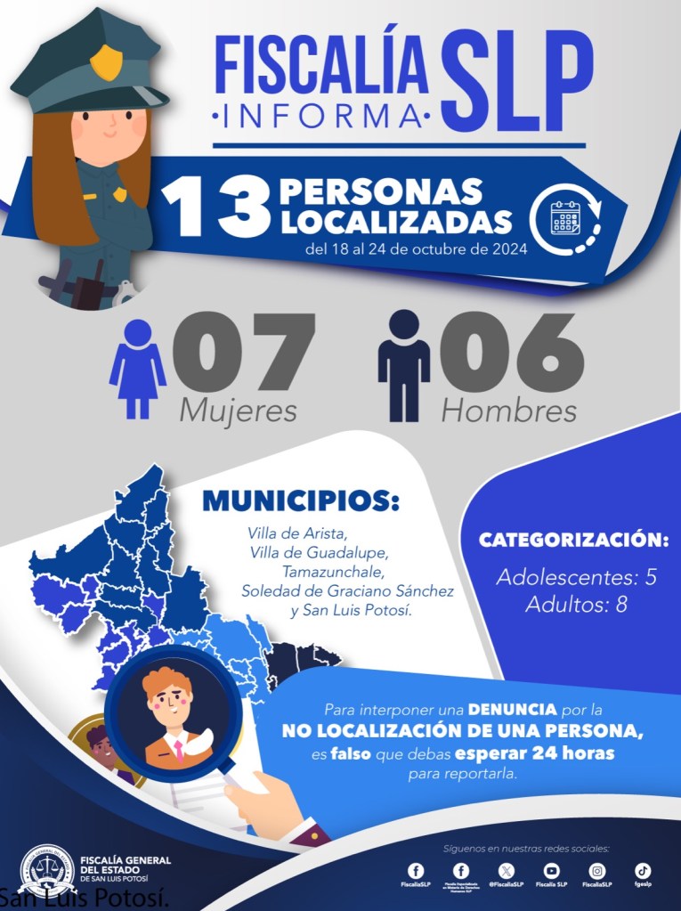 La Fiscalía General del Estado de San Luis Potosí (FGESLP) informa que, gracias a las investigaciones realizadas entre el 18 y el 24 de octubre del presente año, se logró dar con el paradero de 13 personas que tenían ficha de búsqueda en la entidad, asegurando así su reintegración a sus núcleos familiares.