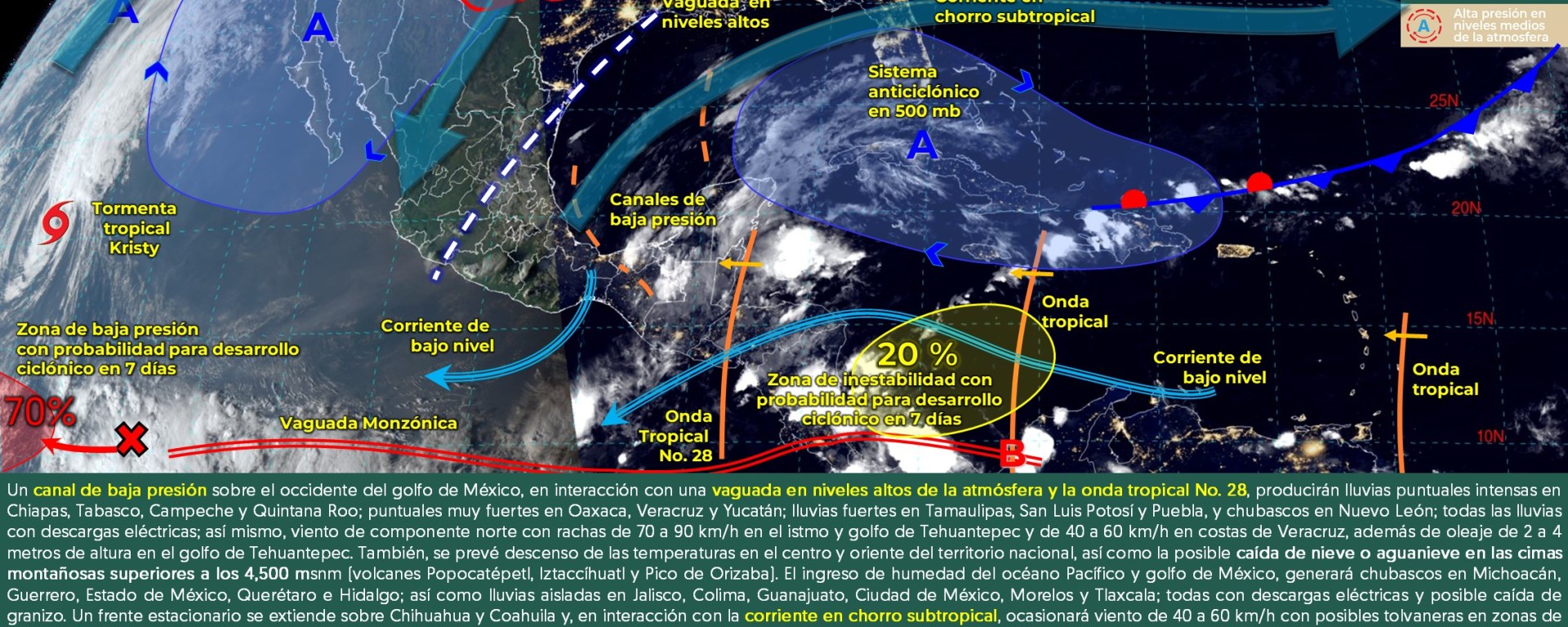 Viento con rachas de 40 a 60 km/h: Campeche, Yucatán y Quintana Roo; con posibles tolvaneras: Baja California, Coahuila, Nuevo León, Tamaulipas, San Luis Potosí, Zacatecas, Aguascalientes, Jalisco, Guanajuato, Querétaro, Hidalgo y Puebla.