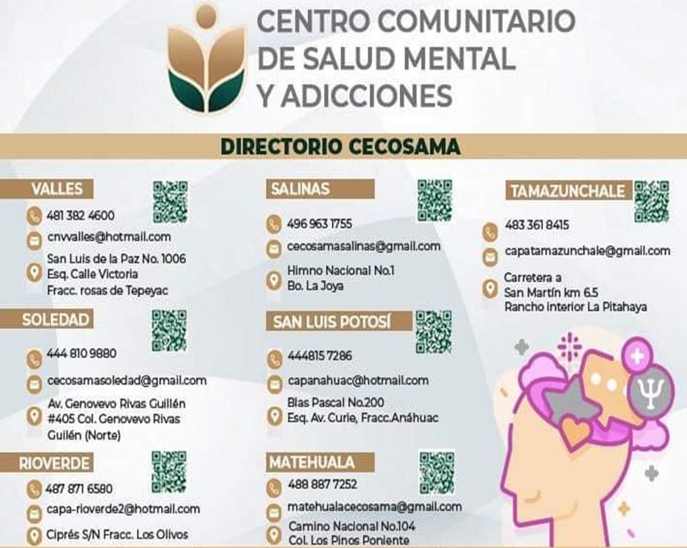 En los Servicios de Salud contamos con los Centros Comunitarios de Salud Mental y Adicciones (CECOSAMA) y los Centros Integrales de Salud Mental (CISAME), para tener atención en este lugar, es necesario ser referido por un Centro de Salud. En San Luis Potosí, el CISAME, está ubicado en Av. Salk 1195, Colonia Progreso, su teléfono es (444) 8 15 94 77, con un horario de atención de 7:00 a 20:00 horas de lunes a viernes y en Ciudad Valles, se ubica en Av. San Luis de la Paz No. 1007, Col. Rosas del Tepeyac, teléfono (481) 381 82 19, ext. 102, de 8:00 a 16:00 horas de lunes a viernes. La atención es gratuita y es para personas sin derechohabiencia, es necesario acudir con referencia del centro de salud que le corresponde.