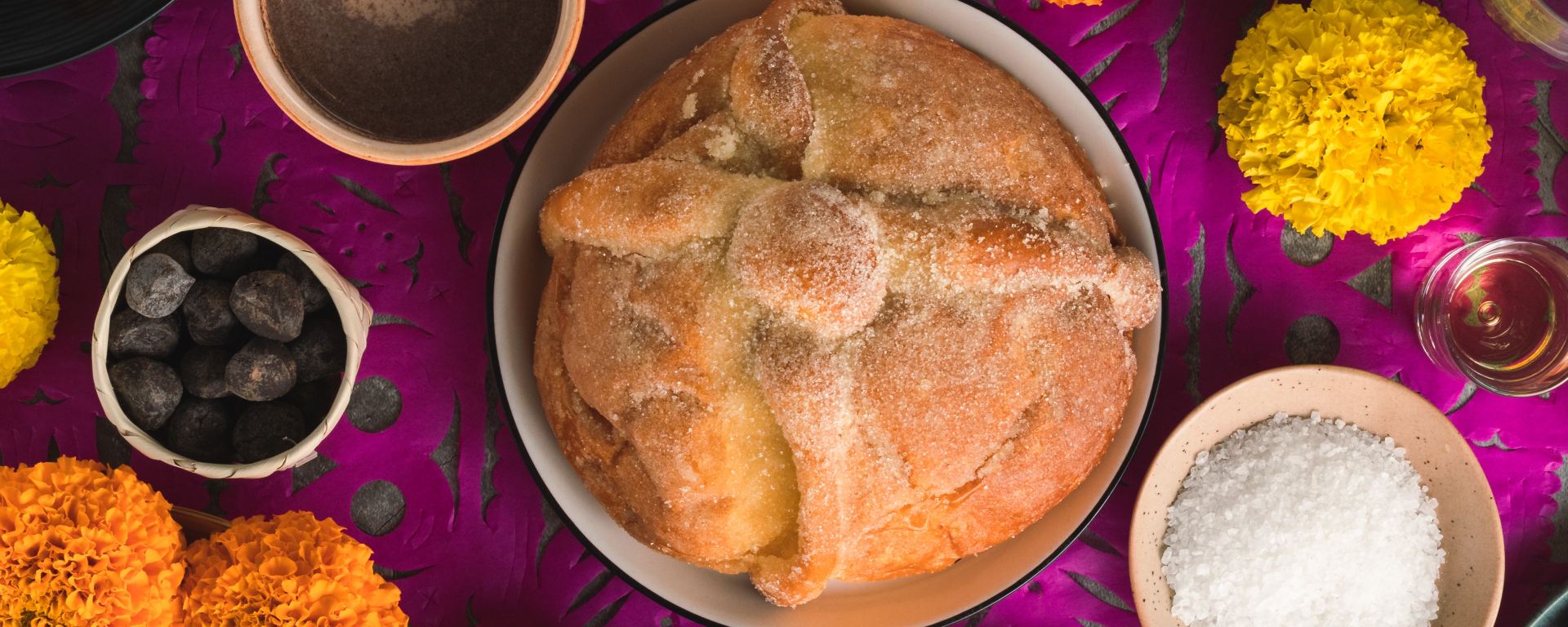 Un poco de historia. El INAH afirma que el origen del pan de muerto es colonial, aunque fue inspirado en prácticas rituales prehispánicas. Su forma circular hace referencia al ciclo de la vida y de la muerte, la ‘bolita’ del centro simboliza el cráneo humano y las tiras en cruz representan los huesos con los que estamos formados, haciendo referencia a los puntos cardinales y también a las lágrimas de los difuntos. Se aromatiza con flores de azahar o con esencia de naranja, pues se cree que la única manera de que los muertos pueden reconocer un lugar es a través del olor de las flores, la luz de las velas y los colores brillantes, por ello en algunas zonas del país se tiñen de colores, rojo, principalmente.