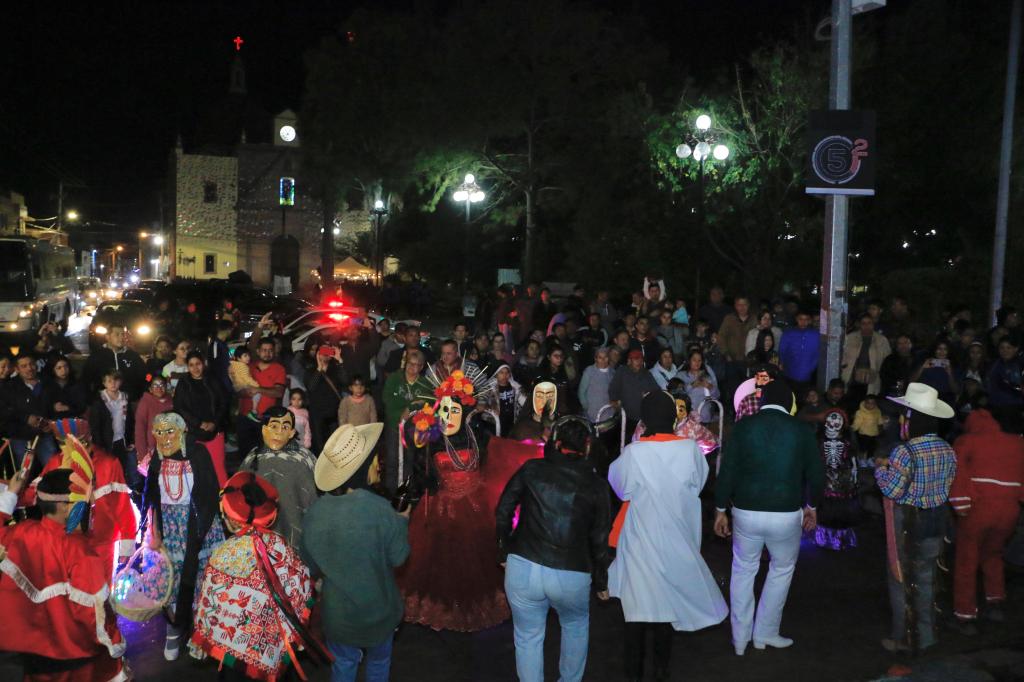 Previo al evento, frente a la presidencia municipal, se llevó a cabo la presentación de la «Danza de los Huehues» de la compañía folclórica María Guadalupe, que cautivo a las y los asistentes a la plaza, para posteriormente llevar a cabo un recorrido por las calles hasta llegar al panteón municipal, para la noche de leyendas.