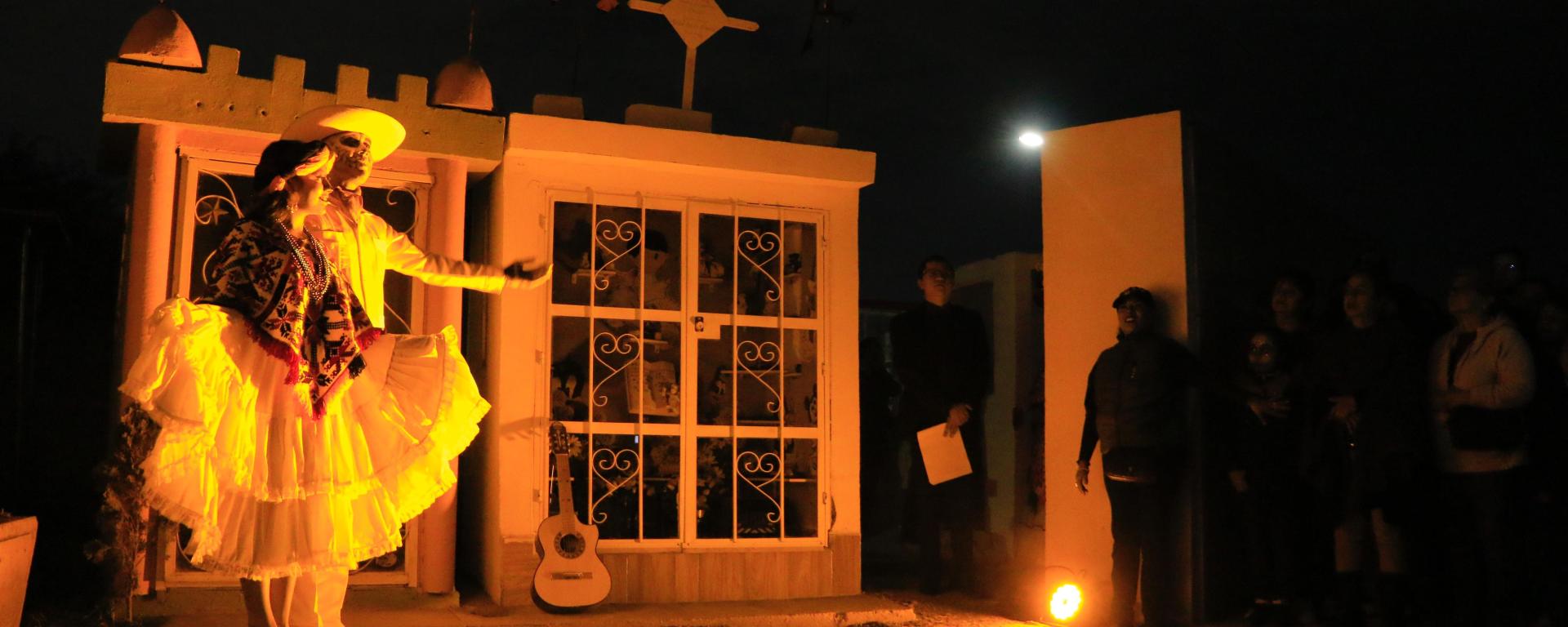 Exitosa noche de mitos y leyendas se vivió en el panteón municipal de Villa de Pozos, con la presentación del grupo Núcleo Danza Escénica, como parte de las actividades del primer Festival de Día de Muertos, que instruyó la Presidenta Concejal, Teresa Rivera Acevedo para preservar las tradiciones mexicanas.