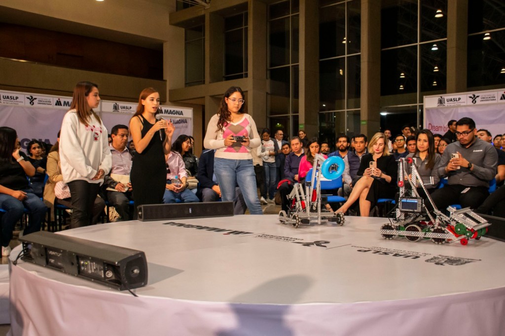 Uno de los momentos más significativos de la noche fue la presentación del primer equipo femenino de la Facultad de Ciencias de la UASLP, que representará a San Luis Potosí en un concurso nacional de robótica, marcando un hito importante, pues es el segundo a nivel nacional integrado sólo por mujeres, demostrando así, su compromiso con la inclusión.