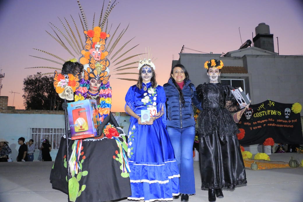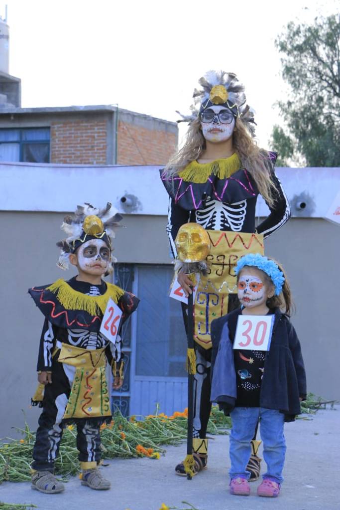 La celebración comenzó con una colorida caravana, frente al panteón de la localidad, que recorrió las calles del pueblo, donde los participantes lucieron vestimentas alusivas al Día de Muertos que atrajo la atención de habitantes de la comunidad de otras localidades.