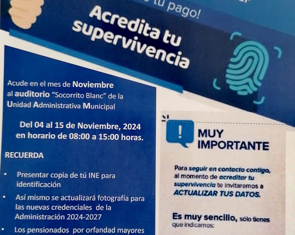 A fin de seguir con el compromiso a favor de las personas jubiladas y pensionadas, así como de quienes se benefician con esta prestación, el Gobierno de la Capital da a conocer que en noviembre se llevará a cabo la acreditación de supervivencia para el personal municipal que se encuentra en este estatus laboral.