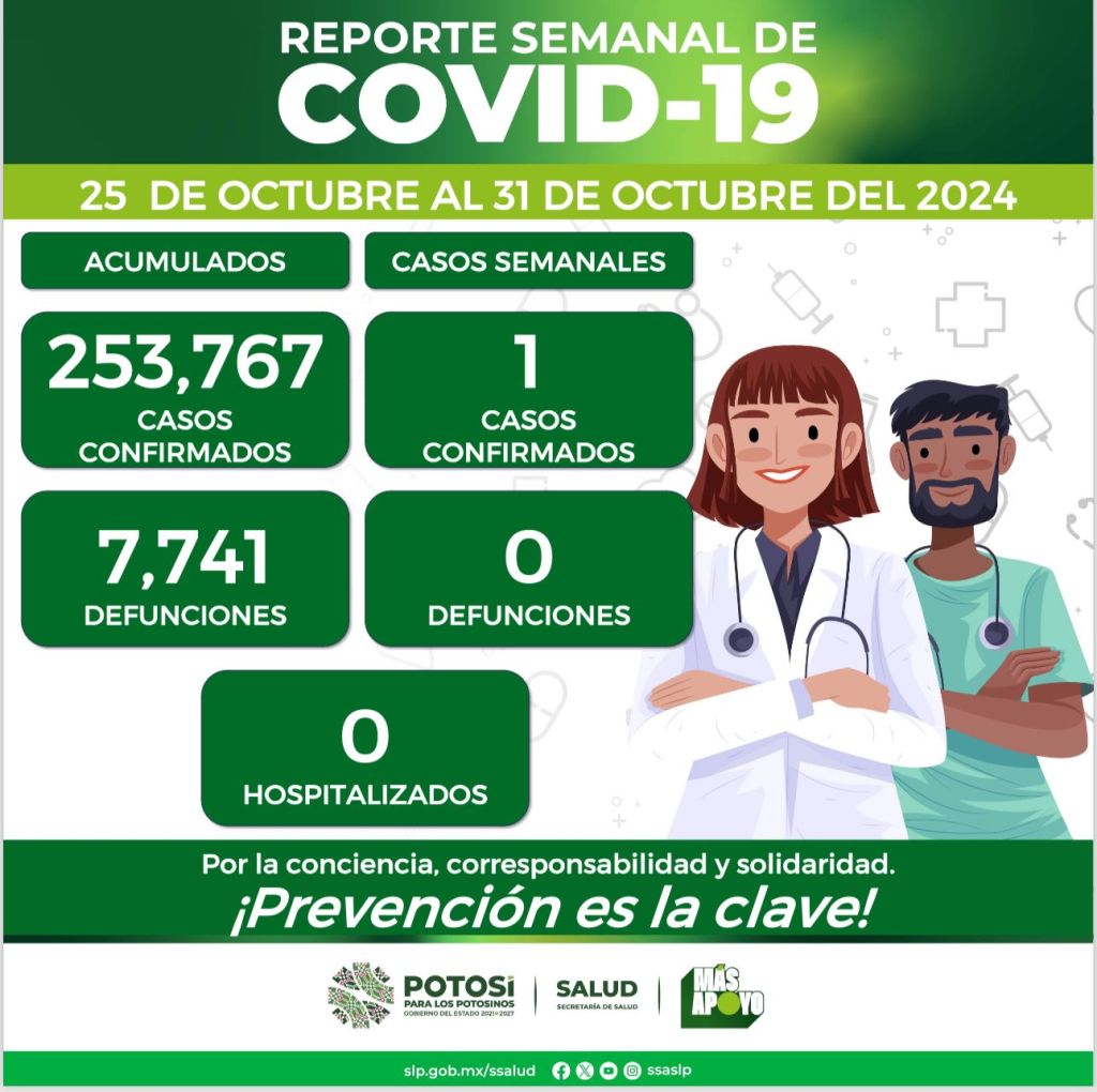 El Comité Estatal para la Seguridad en Salud, dio a conocer que del 25 al 31 de octubre se registró un nuevo contagio de COVID-19, ubicado en la capital potosina, confirmándose un total de 253 mil 767 casos totales de esta enfermedad en el estado.