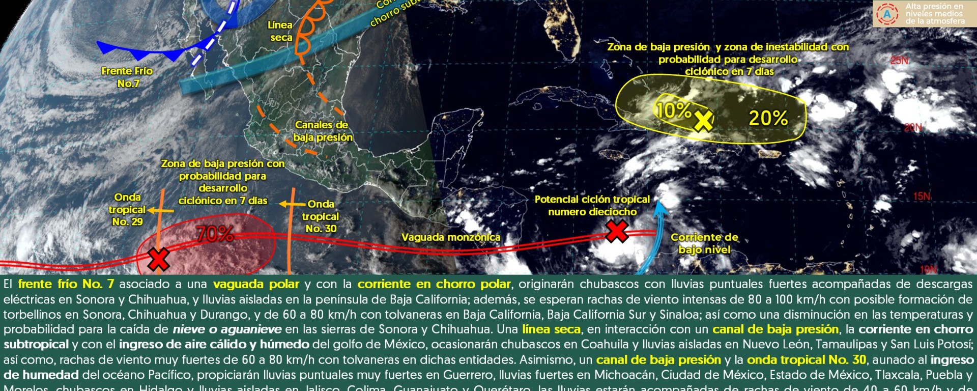 Viento con rachas de 40 a 60 km/h: Tabasco, Campeche, Yucatán y Quintana Roo; con posibles tolvaneras: Baja California Sur, Sinaloa, Nayarit, San Luis Potosí, Aguascalientes, Jalisco y Guanajuato.