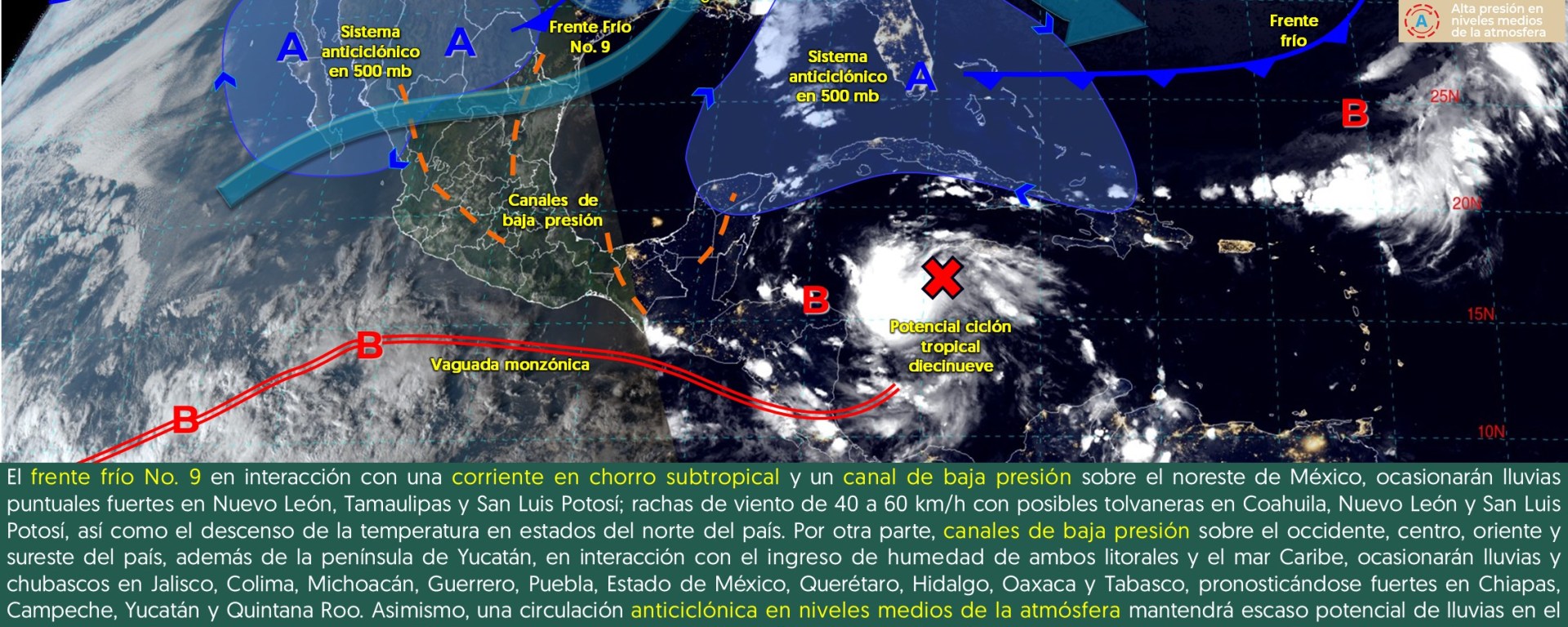 Viento con rachas de 40 a 60 km/h: costa de Quintana Roo; con posibles tolvaneras: Baja California, Zacatecas, San Luis Potosí, Aguascalientes, Jalisco (noreste), Guanajuato, Querétaro, Hidalgo, Puebla, Tlaxcala, Estado de México y Ciudad de México.