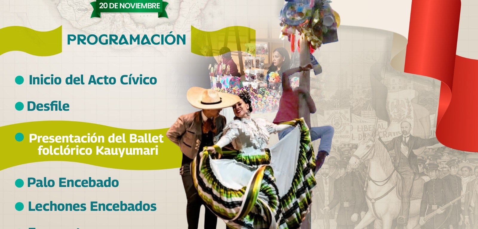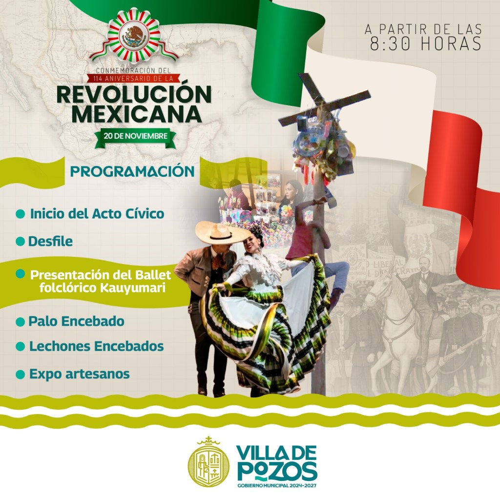 El próximo miércoles 20 de noviembre las calles del municipio de Villa de Pozos se pintarán de los colores patrióticos y sus habitantes vivirán un ambiente festivo con motivo del Desfile Conmemorativo al 114 aniversario de la Revolución Mexicana, que por primera vez se celebrará en el nuevo municipio, informó la Concejal Presidenta, Teresa de Jesús Rivera Acevedo.