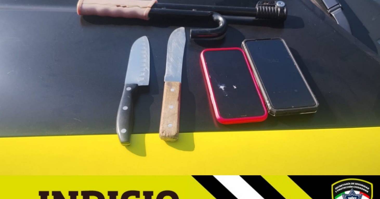 En la revisión preventiva, el detenido de nombre Osvaldo «N» de 34 años fue encontrado en posesión de dos cuchillos, un bastón de seguridad y mil 200 pesos, presuntamente robados del comercio afectado.
