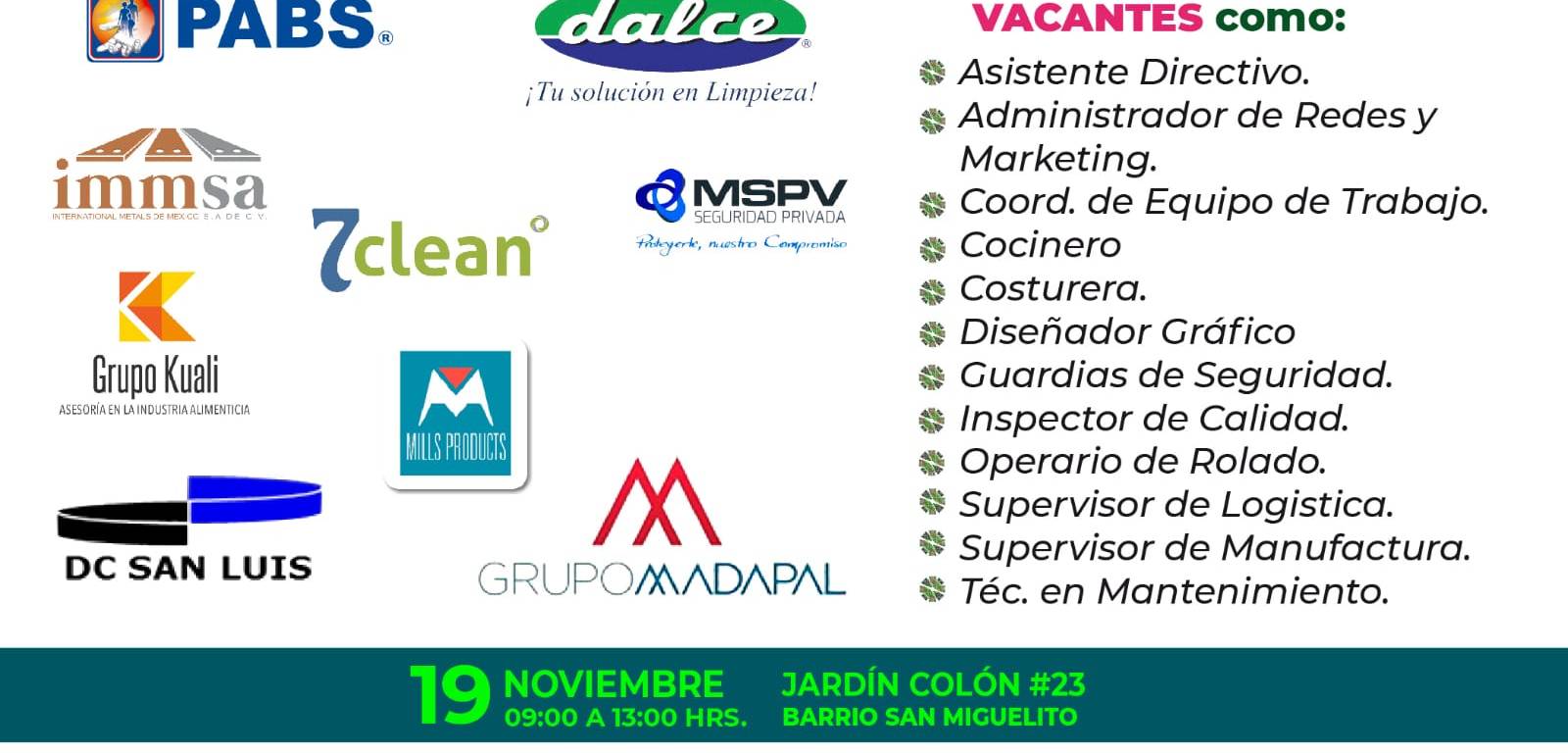 Para brindar más apoyo a las potosinas ofreciéndoles mejores oportunidades de empleo, el Instituto de las Mujeres (Imes) de la mano con la Secretaría del Trabajo y Previsión Social (STPS) y el Servicio Nacional del Empleo (SNE) realizará la décima edición de la Jornada del Empleo en la dependencia ubicada en Jardín Colón número 23, en el barrio de San Miguelito este martes 19 de noviembre de 9:00 a 15:00 horas.