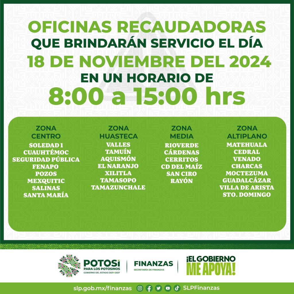 Las oficinas recaudadoras que ofrecerán servicio en la zona metropolitana son Soledad I, Cuauhtémoc, Seguridad Pública, Villa de Pozos, Fenapo, Mexquitic, Salinas de Hidalgo y Santa María del Río, en la Zona Huasteca en Ciudad Valles, Tamuín, Tamasopo, El Naranjo, Tamazunchale, Xilitla y Aquismón, en la Zona Media en Rioverde, Cárdenas, Cerritos, Ciudad del Maíz, Rayón y San Ciro de Acosta y en Zona Altiplano en Cedral, Venado, Charcas, Moctezuma, Santo Domingo, Guadalcázar, Villa de Arista y Matehuala.
