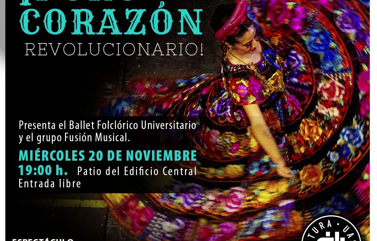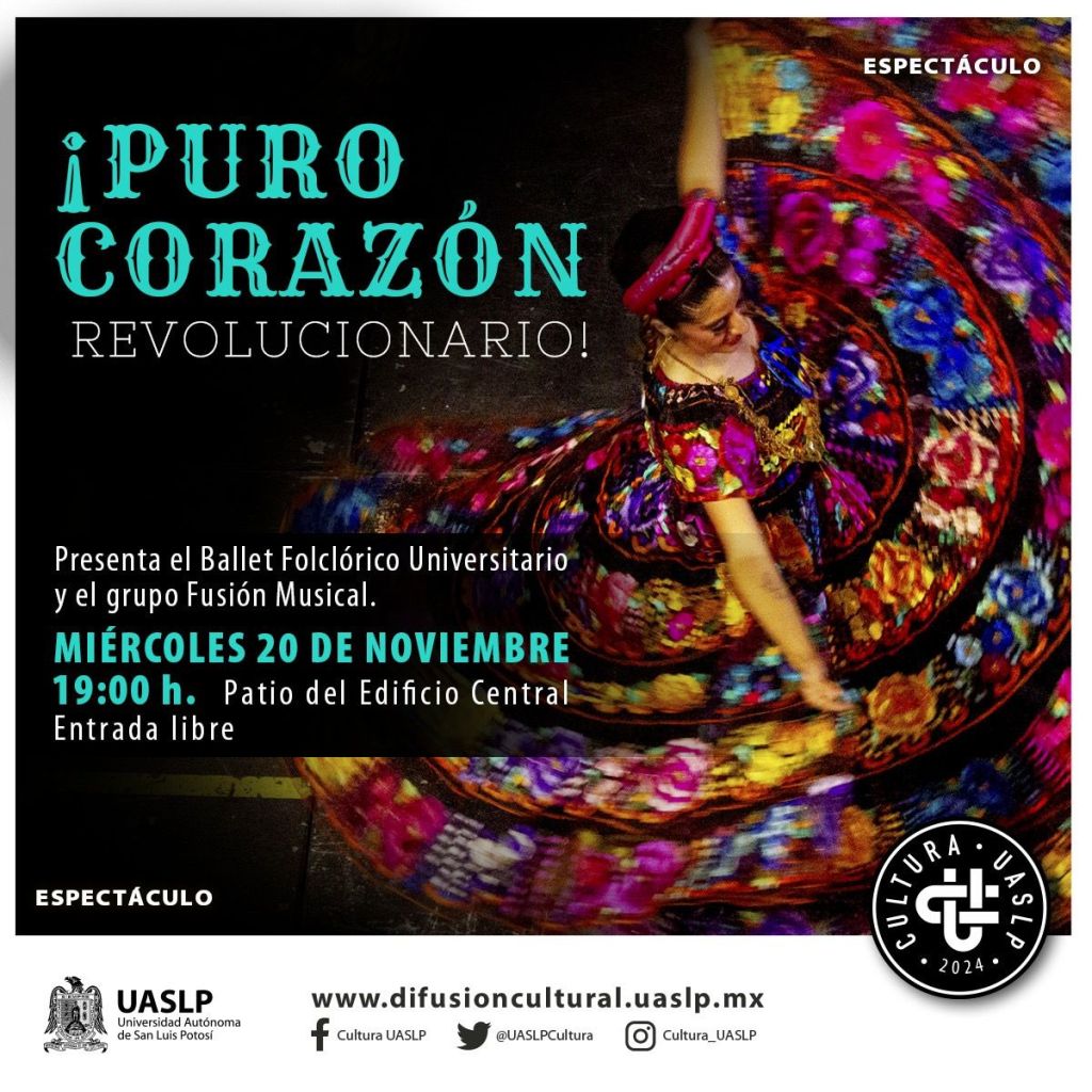 Con la finalidad de promover el arte popular mexicano y la identidad de la nación, la Universidad Autónoma de San Luis Potosí (UASLP), a través de la Secretaría de Difusión Cultural, invita al evento “¡Puro Corazón Revolucionario!”, con la participación del Ballet Folclórico Universitario, junto con el grupo Fusión Musical. La entrada será libre.