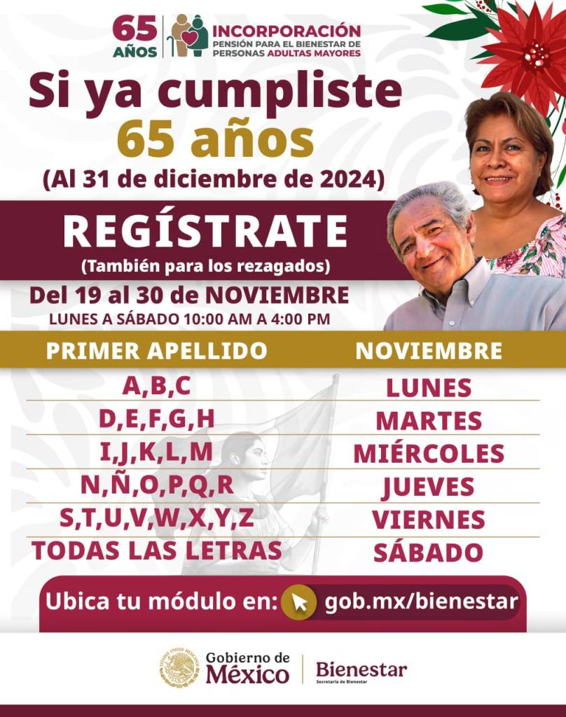 El delegado de Bienestar en San Luis Potosí, Guillermo Morales López, informó que del 19 al 30 de noviembre se realizará el registro de incorporación a la Pensión para el Bienestar de las Personas Adultas Mayores para quienes cumplieron o cumplen 65 años o más al 31 de diciembre de 2024.