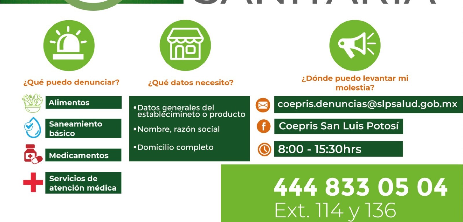 La Comisión Estatal para la Protección Contra Riesgos Sanitarios (COEPRIS) tiene como misión proteger la salud de la población de posibles riesgos sanitarios a través de diversas estrategias y una de las cuales se ha fortalecido por instrucciones del ejecutivo estatal, es la atención de Denuncias Sanitarias de algún producto o servicio que, por alguna omisión o mala práctica, ponga en riesgo la salud de las y los potosinos.