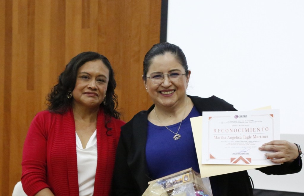 Al terminó de la conferencia, la presidenta del CEEPAC, Paloma Blanco López entregó un reconocimiento y agradeció a conferencista por compartir la realidad que muchas mujeres viven en el ámbito político.