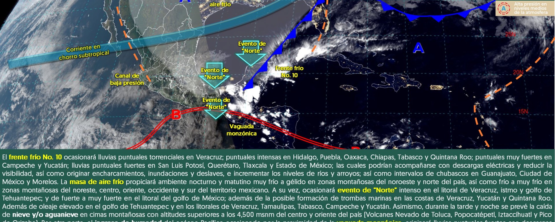 Evento de “Norte” con rachas de viento de 80 a 100 km/h: istmo y golfo de Tehuantepec; con rachas de 60 a 80 km/h: litoral de Veracruz (sur); y rachas de 40 a 60 km/h: litoral de Tamaulipas (sur), Tabasco, Campeche, Yucatán y Quintana Roo.