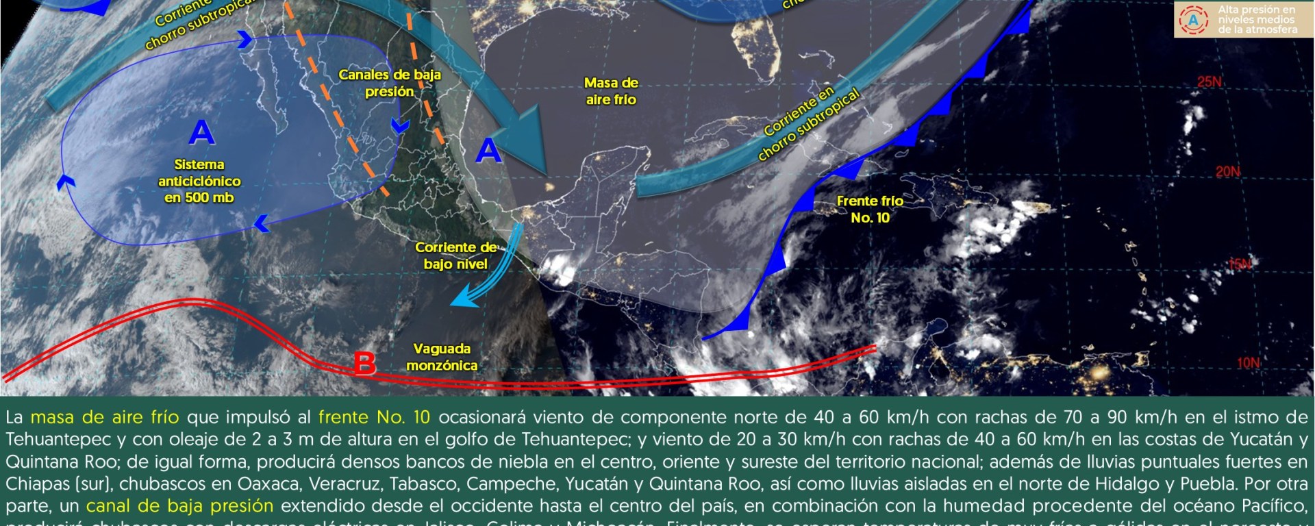 Cielo despejado a parcialmente nublado en el transcurso del día y sin lluvia en la región. Por la mañana, bancos de niebla en zonas altas, ambiente muy frío en la región y gélido con heladas sobre sierras de Chihuahua y Durango. Durante la tarde, ambiente templado a cálido. Viento de dirección variable de 15 a 30 km/h en la región y rachas de 40 a 60 km/h en Chihuahua, Coahuila y Nuevo León.