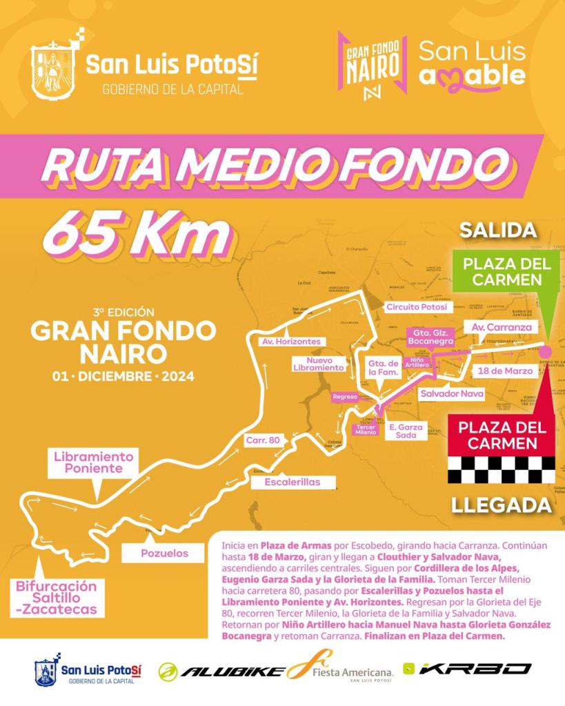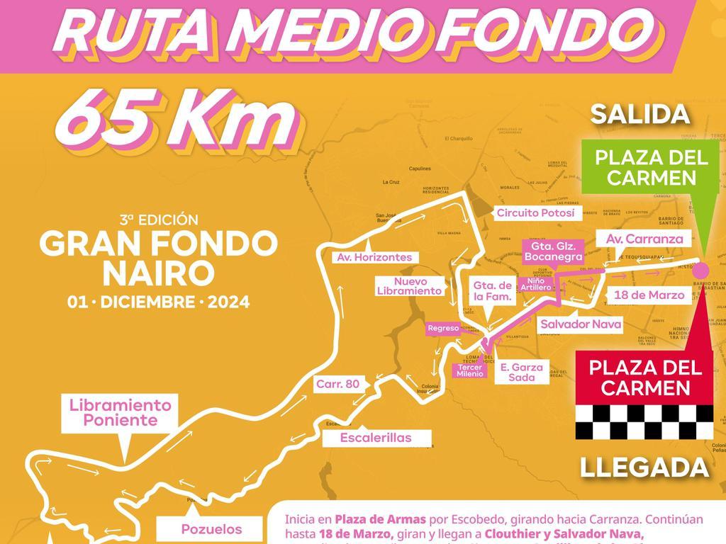 La competencia arrancará a las 7:00 horas del domingo 1 de diciembre en el corazón del Centro Histórico de San Luis Potosí, con salida y meta en la Plaza del Carmen. Los ciclistas iniciarán con una salida controlada sobre la calle de Escobedo, girarán a la izquierda hacia Plaza de Armas y continuarán por la Avenida Venustiano Carranza, luego tomarán la avenida 18 de Marzo, hacia Manuel J. Clouthier, para enseguida incorporarse hacia el poniente sobre la avenida Salvador Nava Martínez.