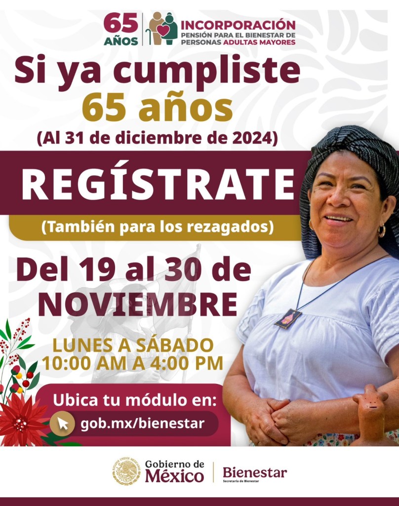 La secretaria Montiel Reyes convocó a las personas Adultas Mayores a acudir a más tardar el 30 de noviembre a cualquier de los Módulos de Bienestar más cercano a su domicilio para realizar su registro que se realiza de lunes a sábado, de 10:00 a 16:00 horas; para ubicar el más cercano es necesario ingresar a la página de la Secretaría de Bienestar: gob.mx/bienestar.