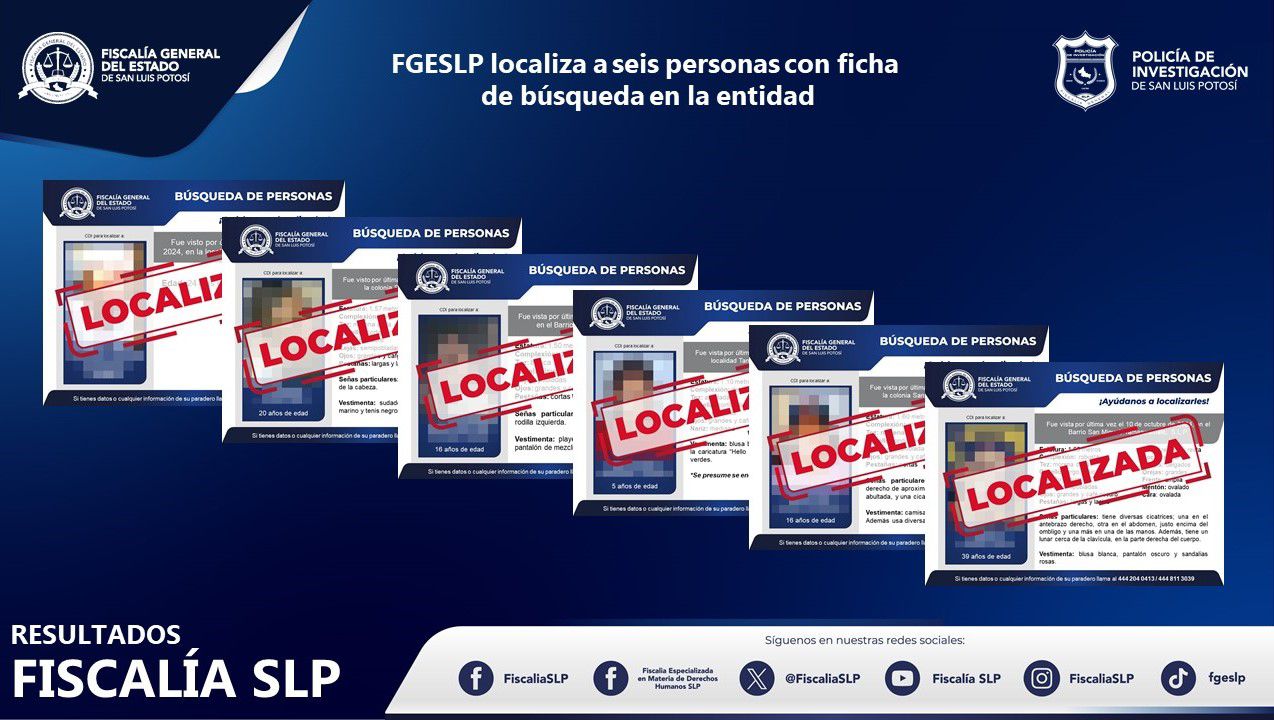 Como resultado de las acciones de investigación implementadas por la Fiscalía General del Estado de San Luis Potosí (FGESLP) entre el 22 y el 28 de noviembre del presente año, fueron localizadas seis personas que contaban con ficha de búsqueda en la entidad potosina.