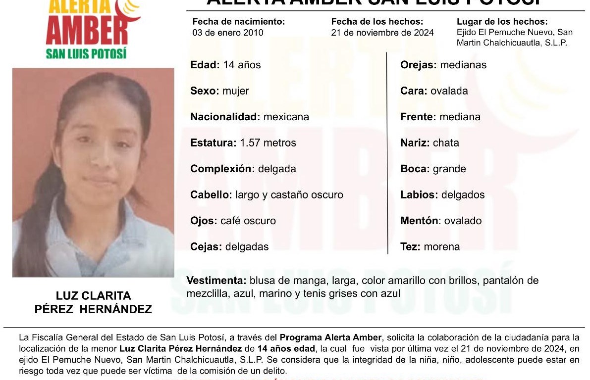 La Fiscalía General del Estado de San Luis Potosí (FGESLP) activó una Alerta Amber para ubicar a Luz Clarita Pérez Hernández, menor de 14 años de edad.