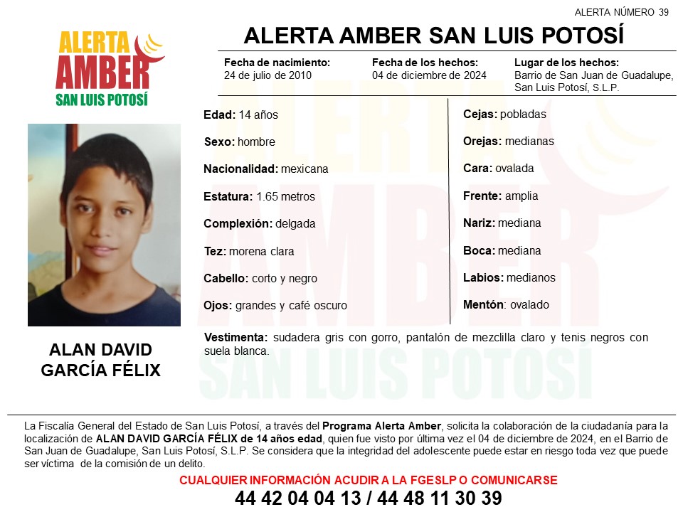 La Fiscalía General del Estado de San Luis Potosí (FGESLP) activó una Alerta Amber para ubicar a Alan David García Félix, un adolescente de 14 años de edad.