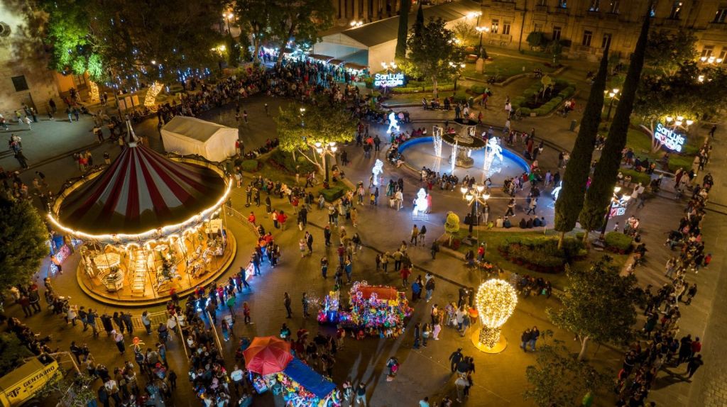 El Ayuntamiento de San Luis Potosí invita a disfrutar el carrusel, el alumbrado, el pino navideño, oso y santa gigantescos instalados en Plaza de Armas y Plaza del Carmen, así como la espectacular iluminación del Jardín de Tequis.