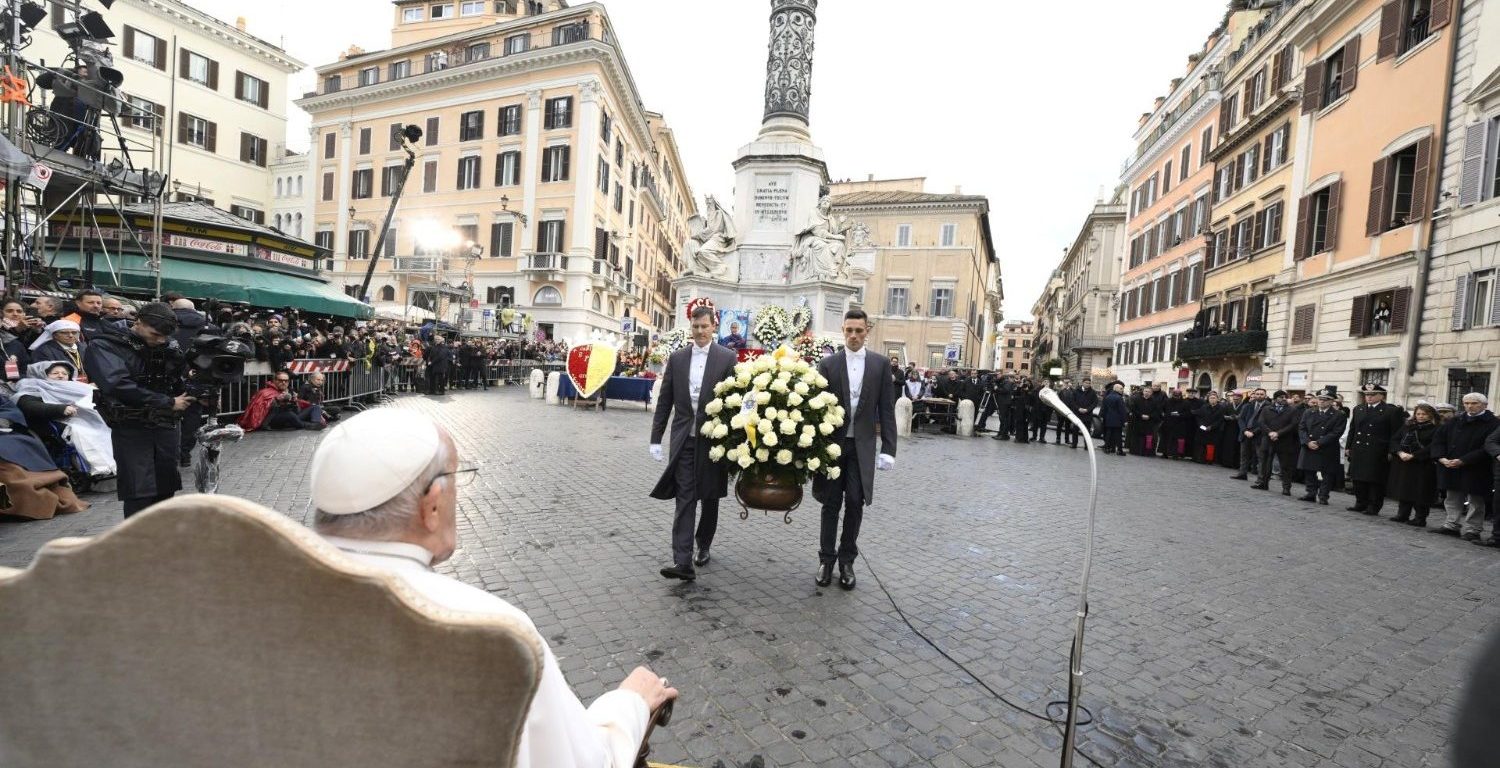 Este domingo 8 de diciembre, en la Solemnidad de la Inmaculada Concepción de la Santísima Virgen María, el Papa Francisco se trasladó a la Plaza de España en Roma para llevar a cabo el tradicional acto de veneración a la estatua de la Purísima. Antes de ello, realizó una parada en la Basílica de Santa María la Mayor, donde rindió homenaje a la Salus Populi Romani.