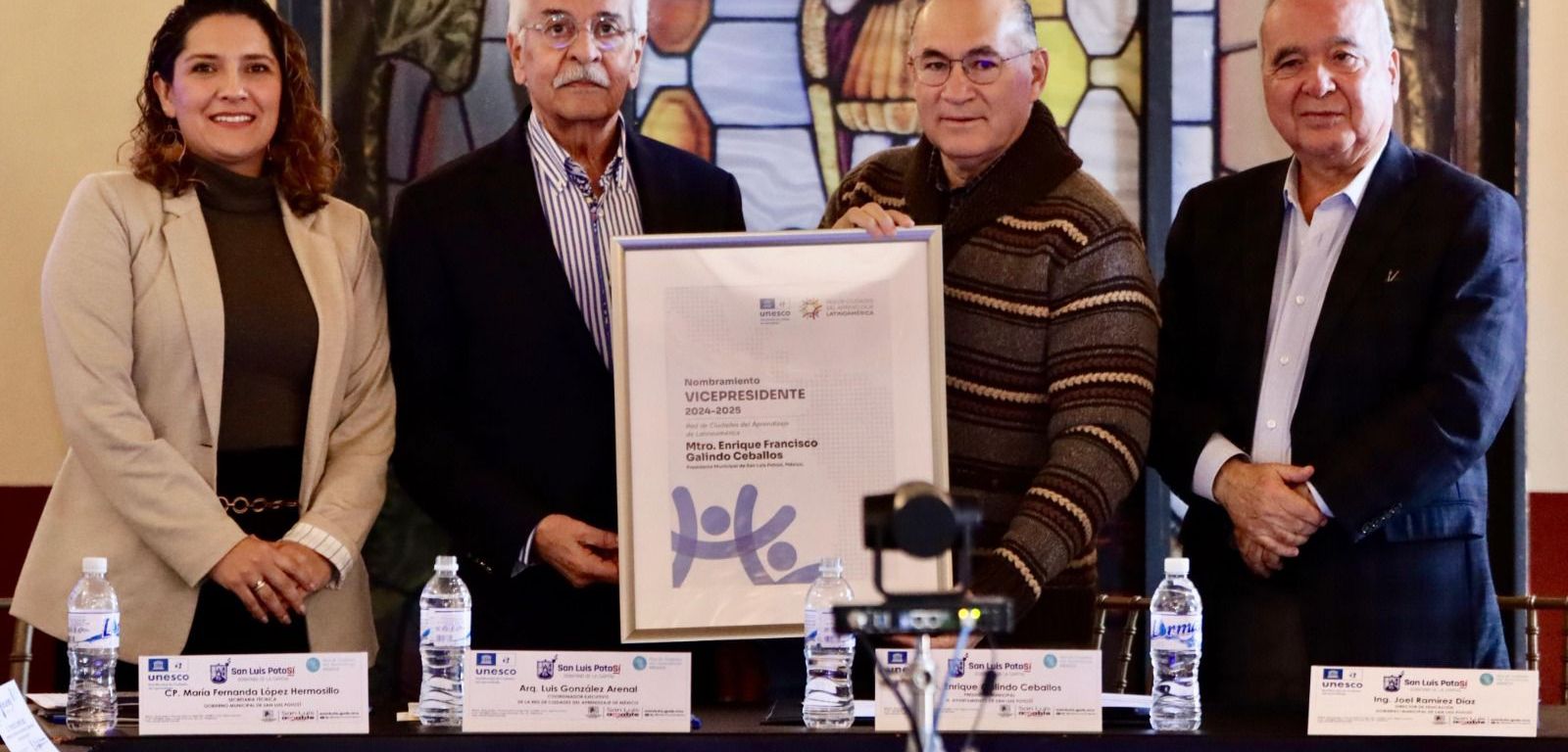Durante la sesión, el Alcalde Enrique Galindo Ceballos recibió también el nombramiento como Vicepresidente de la Red de Ciudades del Aprendizaje de Latinoamérica, “cargo que es un orgullo para todo México y representa un fuerte impulso para San Luis Potosí hacia los objetivos de llevar el aprendizaje a todos los sectores”.