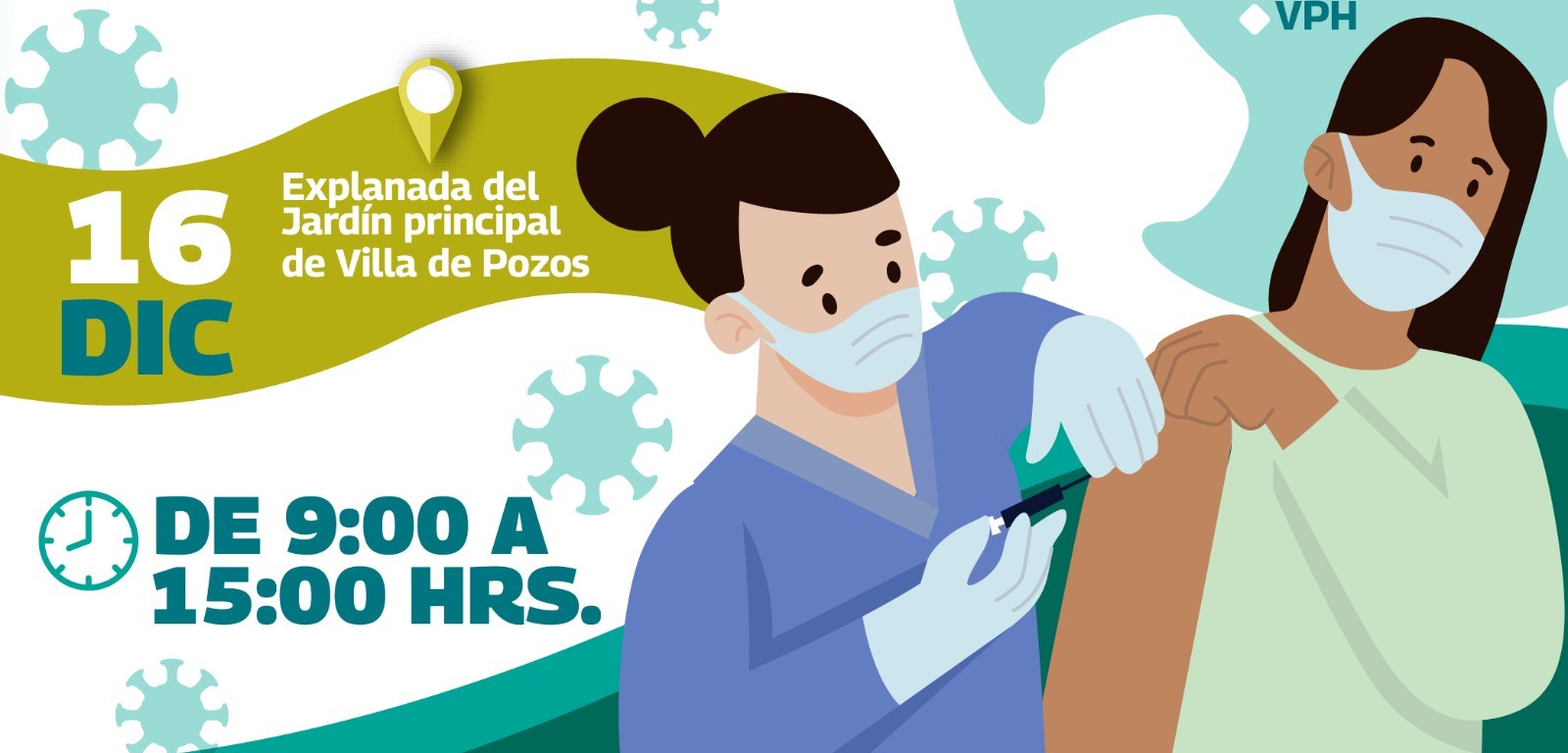 El Concejo Municipal de Villa de Pozos a través de la Comisión de Salud y en coordinación con los servicios de Salud de Gobierno del Estado, invita a las y los ciudadanos a participar en una jornada de vacunación que se llevará a cabo el próximo 16 de diciembre, en la explanada del Jardín Principal del municipio en un horario de 9 a 15 horas.