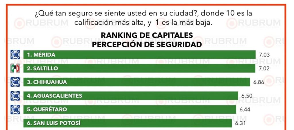 Finalmente, en lo que respecta a la percepción ciudadana de seguridad, la capital potosina quedó en sexto Lugar, mientras que los primeros lugares fueron para Mérida, Saltillo, Chihuahua, Aguascalientes, y Querétaro, en este orden.