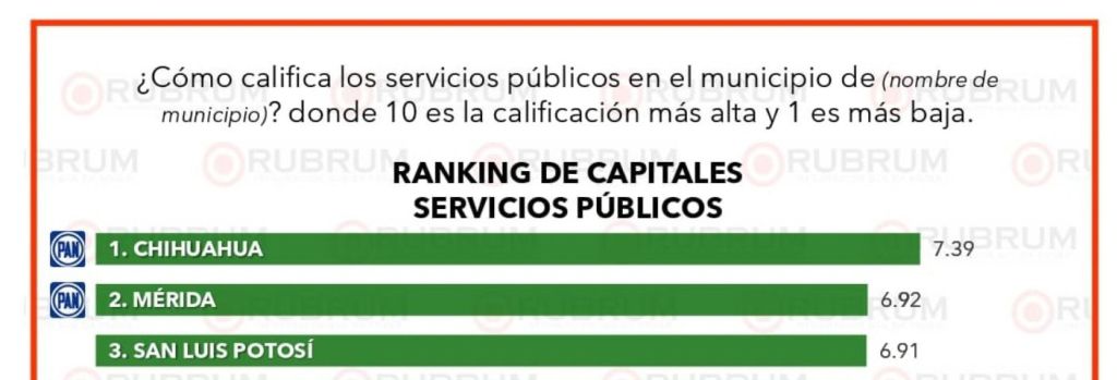 En el ranking de Servicios Públicos, el Ayuntamiento de San Luis Potosí está en tercer lugar, con 6.91 puntos, sólo por debajo de Chihuahua, que obtuvo 7.31 puntos y Mérida, con 6.92.