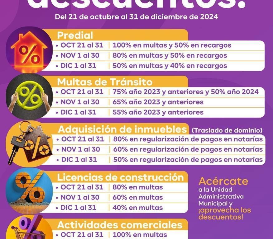 En el pago del predial, se aplicará un 50 por ciento en multas y un 40 por ciento en recargos a quienes tengan pendiente algún pago; mientras que en infracciones de tránsito, será del 55 por ciento en multas del año 2023 y anteriores, descuentos que concluyen el 31 de diciembre.